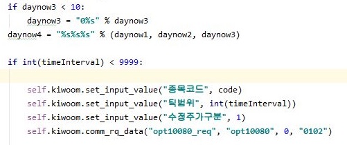 그리고 나서 if문을 가지고 와서, 일봉차트가 아니라면 기존의 방법대로 하라는 식으로 명령을 내리도록 하고, 그렇지가 않은 경우가 문제입니다.