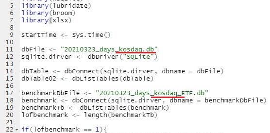 R을 다시금 작동 시키고 나서, 위 스크린샷처럼 먼저 코스피의 내용에 대해서 ETF와 그냥 종목에 대해서 데이터 베이스 파일을 입력하도록 합니다.