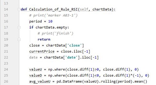 그리고 나서 이 메서드를 기존의 MFI를 계산하기 위한 코드를 주석처리하고 나서, 그 자리에 집어넣도록 합니다. 이렇게 하는 것으로 일단은 RSI를 이제 이 프로그램은 계산하게 됩니다.