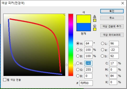 그리고 선명한 것과는 무슨 차이가 있는지는 모르겠습니다만, 일단 선택되어 있는 색상보다 더 밝은 색상의 색을 원하면 수직인 방향으로 위로 올리면 됩니다.