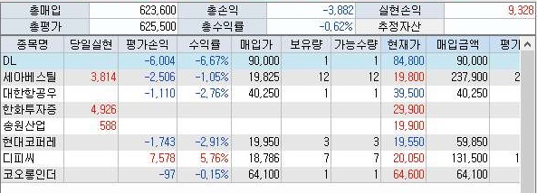 그리고 여기서도 상당힌 수익을 RSI지수 기반으로 해서 나온 수익만큼 크지는 않지만, 이날 하루 많이 거둔 것을 확인할 수 있었습니다. 이렇게해서 이날도 기분좋게 시작을 할 수 있었습니다만, 아무튼 간에 일단 큰 손해를 보지 않고 있고, 그렇게 크게 총손익에서 나오는 손해가 커지지 않고 가고 있는 것이 포인트 이기는 합니다. 당일 실현 손익은 크지는 않더라도 하루하루 이익이 나오면 누적이 되고, 이게 총손익에서 보유한 주식의 가치가 내려가서 나오는 손해를 상회할 경우, 그 때 부터 이익이 나온다고 할 수 있어 보입니다.