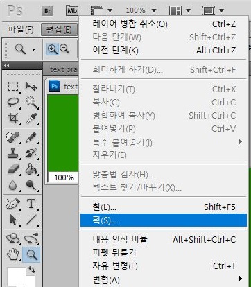 먼저 모든 문자열을 하나의 레이어로 병합하는데 성공했다면, 이제 편집 메뉴에 있는 획 메뉴를 눌러 보도록 합니다. 이렇게 해서 테두리를 만들어 보고자 합니다.