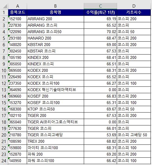 그리고 나서 다음으로 해야 하는 것으로는 역시나 이 리스트 중에서 다른 종목, 예를 들면 실물자산 같은데 투자하는 ETF는 빼고 위 스크린샷과 같이 26개만 코스피에서는 추려 보았습니다.