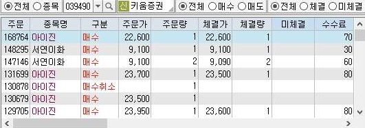 그래서 이번에는 실험군인 3000만원을 가지고서 한번 실험을 하였는 알고리즘 트레이더의 거래 내용인데 주문량이 상당히 많은데, 문제는 그게 또 체결이 된다는 것이 신기하기는 신기합니다. 아무튼 여기서 중요한 것은 일단 어떻게 된 것인지 매도는 이날 하루 일어나지 않았습니다.