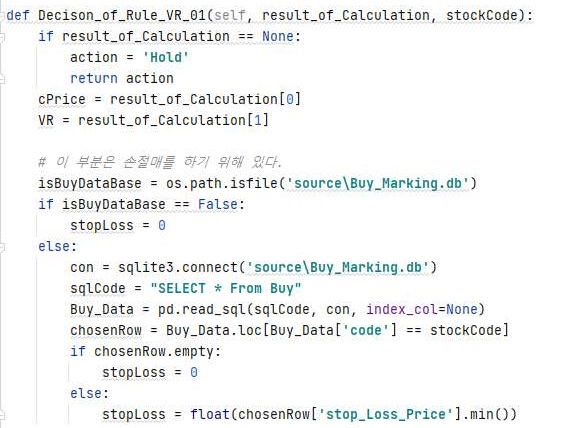 그리고 지난번 포스팅에서 언급하지 않았는 VR지수를 어떻게 적용했는지에 대해서 한번 이번 포스팅에서 올려 보고자 합니다. 일단 VR지수를 계산하기 위한 코드의 전반부 입니다.