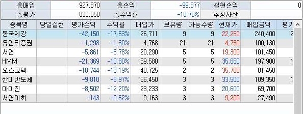 어제 주식시장 부터 공매도가 재개 되었다고 들었는데, 오늘은 이 영향을 주식시장이 많이 받는 날인 것일까요? 일단 전반적으로 침체되어 있는 장인 것을 확인할 수 있기는 있었습니다. 그래도 일단 제 알고리즘 트레이더를 한번 시험해 보기 위해서 작업에 들어갔고, 그 결과를 올려 보고자 합니다.