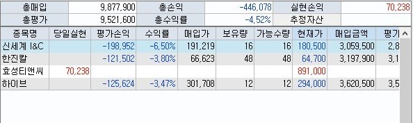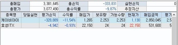 다만 보유하고 있는 주식의 가치하락으로 인한 손실이 드디어 90%에 육박하는 상황이 되면서 이래저래 상황이 좋지 않게 흘러가는 듯 9%대의 손해를 기록하고 있습니다.