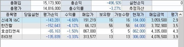 다만 이익보고 있는 종목은 그래도 이익을 보고 있고, 그대로 손해를 보고 있는 종목은 그대로 있어서 39만원을 살짝 넘는 손해를 입고 있습니다.