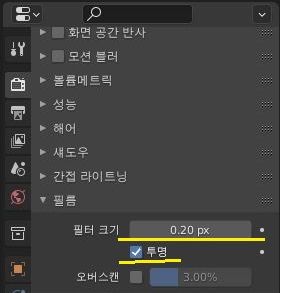 다음으로는 디지털 카메라 마트로 가서, 필름이라는 항목이 있습니다. 여기다가 필터크기를 0.2px로 두도록 하고, 그 다음으로는 투명항목을 한번 체크해 보도록 합니다.