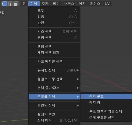 그리고 이제 에지 루프라는 것이 있는데, 이게 왜 있으냐 하면, 다음의 스크린샷을 보시면 생각외로 상당히 유용하다고 할 수 있습니다. 일단 선을 하나 선택하고 나서, 위 메뉴를 선택하면........