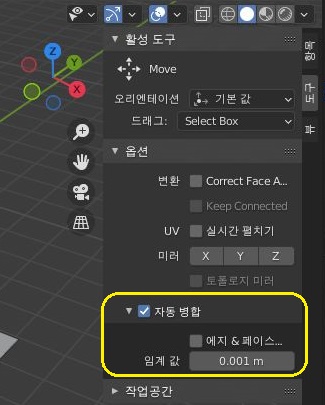 그리고 나서 다음으로 언급할 것은 미러 아래에 있는 자동병합인데, 입계값 이하인 모든 버텍스나 에지등은 모두 합쳐지라고 명령을 내릴 수 있게 되어 있습니다. 이런 내용까지 일단 실습에 성공했고, 나머지 내용은 이어서 작업할 수 있도록 어떻게 계속 실습을 해 보아야 겠습니다.