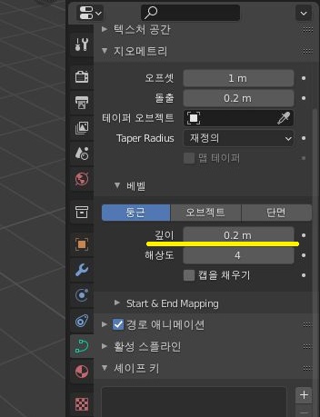 이제 베벨이란느 항목에 들어가서 기본으로 깊이가 0으로 되어 있는데, 이 항목에 대해서 0.2라고 주도록 합니다. 이렇게 주고 나서.........