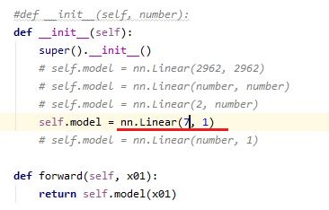 그리고 나서 입력되는 데이터는 7개고, 출력되는 결과물은 close1개이기 때문에, 이를 위해서 일단 모델을 7 X 1로 입력을 7, 출력을 1로 주도록 합니다.