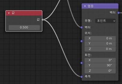 다음으로는 영어로는 value node, 한글 블렌더에서는 '값'이라는 노드를 추가해 주도록 하고, 이 값 노드에서 값을 맵핑의 축적 - scale항목에 가져다 주도록 합니다.