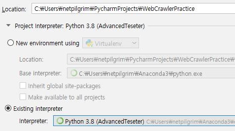 일단 새로운 프로젝트를 생성해야 하는데, 하는 방법은 그렇게 어렵지는 않았습니다. 일단 기존에 사용한 적이 있는 파이썬 환경을 그냥 가지고 오도록 합니다.