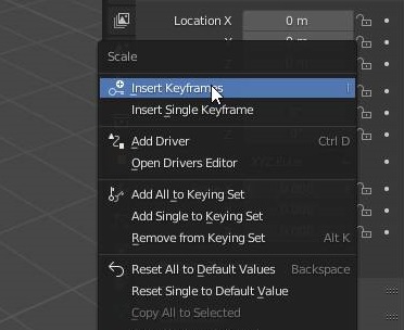 그리고 저 위치에 일단 마우스 커서 - 스케일을 입력하는 부분에서 마우스 우클릭을 해서, 위 스크린샷에서 볼 수 있는 것처럼, 일단은 키프레임 넣기라는 Insult Keyframes를 넣어 주도록 합니다.