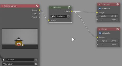 먼저 노드트리에서 pixelation이라는 그룹을 가지고 온 화면입니다. 일단 기본적은 compositing의 노드에서 가지고 왔으며, 다음으로 가야 할 것으로는 역시나 얼마만큼 픽셀아트화 시키고 하는 조정이 필요합니다.