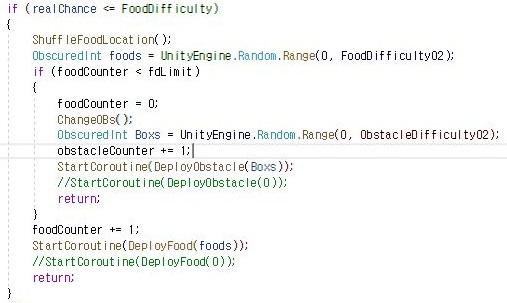 일제로 일정양 이상의 무언가가 나오게 되면, 다음에는 음식이나 장애물이 나오도록 설정을 바꾸어 주었습니다. 그런데 문제는 연산 기호자를 잘못 설정해서 한참을 삽질한 다음에야 어떻게 무언가 나은 결과를 만들 수 있기는 있었습니다. 아무튼 이런 식으로 이제 밸런스도 어떻게 건들고 있기는 있는 중 입니다.