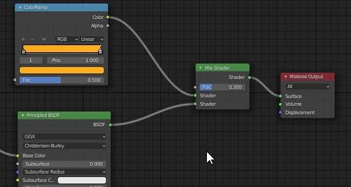 먼저 종이 텍스처를 씌운 것은 좋았는데, 문제는 종이의 색이 칙칙하기만 한 색상이어서 그렇게 좋아 보이지 않습니다. 마치 부적처럼 보이게 하기 위해서, 위 스크린샷에서 보이는 것과 같이 일단, mix shader를 놓고 컬러램프를 놓았습니다.