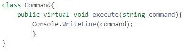 그리고 나서 다음으로 한번 Command 클래스의 내용을 살펴 보도록 합니다. 여기서는 역시나 execute라는 메서드를 public으로 보유하고 있으면서, 명령의 내용은 단순하게 콘솔에 문자를 입력하라는 것이 전부 입니다. 문제는 제대로 상속을 시켜주기 위해서 잊으면 안되는 것이 있는데, 우선 상속시켜서 사용할 메서드는 void와 같이 무엇을 return해서 반환할지 결정해 주는 문자열 앞에다가 virtual 이라는 키워드를 입력해 주어야 합니다.