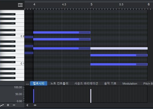 우선 C 로 시작하는 화음을 토닉이라고 이름붙여 있는데, 토닉에서 토닉으로 이어지는 화음의 흐름을 위 스크린샷과 같이 1초 단위로 끊어서 만들어 보고자 합니다. 사실 1초 이하로는 제대로 노트가 찍히지 않는 문제점이 나오기는 했습니다.
