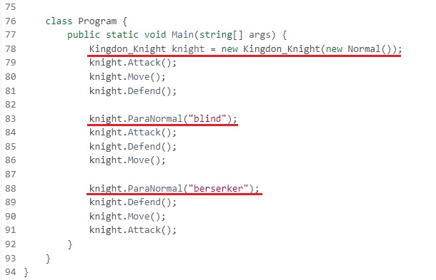 그리고 나서 실제로 상태를 적용받게 될 클래스, 여기서는 왕국기사라는 이름을 붙였는데, 이 기사의 경우에는 switch문으로 구성이 되어 있는 이 방식을 이용해서 각각의 상태 클래스를 new를 붙여서 불러올 수 있도록 만들어야 합니다. 이러면 메모리를 너무 많이 차지 하지 않을까 하는 생각이 들기도 하지만, new를 붙인다고 해서 이게 반드시 메모리를 더 먹고 그런 것은 아니라고 들었습니다.