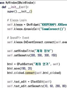PyQt9 키움증권 API와 연동해 보기-PyQt를 연습해 보기-4- 안녕하세요? 지난번 노트북의 고장으로 인해서 PyQt를 연습해 보는 것이 많이 늦어졌습니다. 그래도 어떻게 수리를 다 받은 다음에, 이에 대해서 한번 마지막 실습에 들어가 보았고, 관련된 내용을 한번 포스팅 해 보고자 합니다. 먼저 계좌정보를 얻어오기 위한 코드입니다. 여기서는 일단 다른 특별한 것은 없고, QPushButton()메소드로 누를수 있는 버튼을 만듭니다. 그리고 나서 QTextEdit()으로 수정을 할 수 없는 텍스트 상자를 만들어 주도록 합니다. 그렇게 해서 버튼을 누르면, dynamicCall()메소드를 써서, 로그인 정보중에 "ACCNO"라고 해서 계좌번호를 가지고 오도록 합니다. 그리고 나서 event_connect()라는 메소드를 사용해서 err_code를 가지고 와서, 로그인에 .. 2018. 11. 17. 키움증권 API와 연동해 보기-PyQt를 연습해 보기-3- 안녕하세요? 아깝기는 하지만, 일단 64비트용 아나콘다를 언인스톨 한 다음에, 관련된 내용을 한번 실습해 보았고, 어느정도 성공을 거두어서 관련된 내용을 포스팅 해 보고자 합니다. 먼저 아나콘다가 설치되어 있는 폴더로 가서, Uninstall anaconda라는 실행 프로그램을 실행 시켜서 64비트용 아나콘다를 삭제하도록 해 봅니다. 일단 아나콘다의 설치에도 다소 시간이 걸린 만큼, 언인스톨에서도 다소 시간이 걸리는 것을 볼 수 있었습니다. 그래서 하는 수 없이 이전에 설치해 둔 32비트용 아나콘다에서 새로운 파이썬 가상 환경을 만들어 주도록 해 봅니다. 그리고 나서 PyQt5는 아나콘다 네비게이터가 아닌, 프롬프트에서 설치해 주도록 합니다. 그리고 나서 PyCharm으로 돌아가서, 방금 만들어준 가상환.. 2018. 11. 16. 키움증권 API와 연동해 보기-PyQt를 연습해 보기-2- 안녕하세요? 지난번 포스팅에서는 어떻게 기초적인 메세지 박스를 띄우는 데는 성공했습니다만, 문제는 이제부터가 문제라고 해야 할까요? 본격적으로 키움증권에서 제공하고 있는 Open API와 파이썬을 연동하는 작업에 시작을 들어가면서, 한번 전자책인 '파이썬으로 배우는 알고리즘 트레이닝'이라는 책의 내용을 실습해 보고 있는데, 이래저래 좌우충돌이 많은 상황입니다. 일단 지난번 포스팅에서 Check State라는 글자가 제대로 안 보이는 문제가 벌어졌는데, 이 문제를 해결하기 위해서는 위 스크린샷처럼 Object.resize( ###, ###) 라고 해서 resize라는 명령어를 사용해서 일일히 사이즈를 지정하면 해결이 됩니다. 하지만 Object.resize(Object.sizeHint()) 라고 해서 si.. 2018. 11. 15. 키움증권 API와 연동해 보기-PyQt를 연습해 보기 안녕하세요? 지난번 포스팅에서 어떻게 해서 방법을 찾아낸 PyQt가 있다는 것을 알아내기는 했는데, 이걸 마스터한다는 것은 아니겠지만, 그래도 어느정도는 쓸 수 있도록 한번 연습해 보고자 했으며, 그 내용을 이번 포스팅에서 올리고자 합니다. 일단은 키움증권 Open API를 등록하는 데는 성공했습니다. 이제 키움증권 Open API를 사용할 수 있게 되었습니다. 그리고 다운로드 받은 KOA studio의 압축을 해제하면, 위 스크린샷과 같은 아이콘이 나오는데, 실행파일을 더블클릭해서 실행을 하도록 해 봅니다. 일단 접속이 되면, 파일을 다운로드 받아서 버전업이 되는 것을 볼 수 있었습니다. 그리고 다음으로는 모의투자에 접속할 수 있도록 키움증권 홈페이지에서 모의투자를 신청해 보도록 합니다. 그리고 관련된.. 2018. 11. 15. 이전 1 2 3 다음